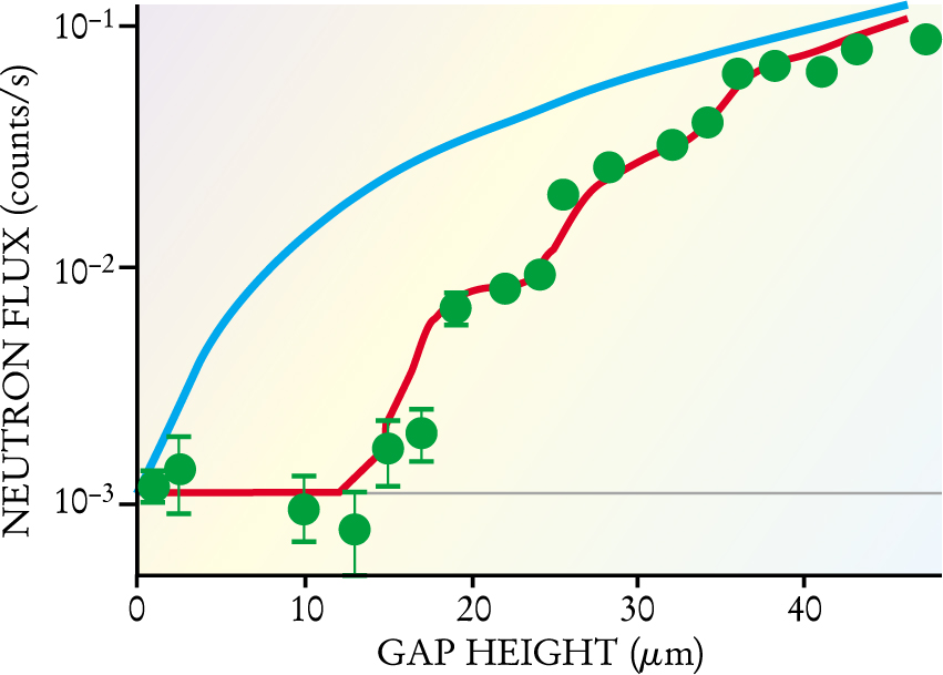 The red curve in figure 3 is the detailed prediction of the neutron flux reaching the detector. The blue curve, with no threshold, is what one would expect simply from geometric and phase-space considerations, without any quantum effects. The data clearly favor the quantum-mechanical prediction, though the extremely limited statistics can only hint at quantum steps beyond the first. “Our experiment had to select only one in a billion incoming reactor neutrons,” Nesvizhevsky told us.