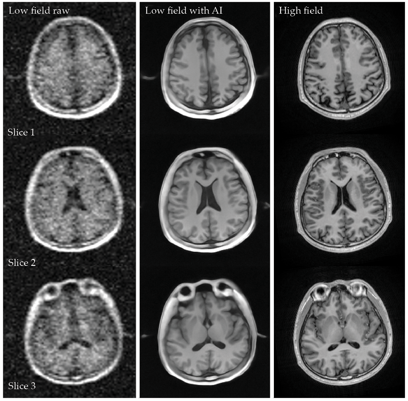 Artificial intelligence (AI) can reduce the noise and improve the spatial resolution of MRI. The left column shows image slices of a healthy human brain collected by a prototype 0.05 T scanner. The middle column shows the same images corrected with an AI deep-learning algorithm, and the right column shows results from a conventional 3 T scanner. Although some details are sharper in the high-field instrument’s images, the AI-reconstructed images show many of the same anatomical features. (Adapted from ref.