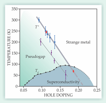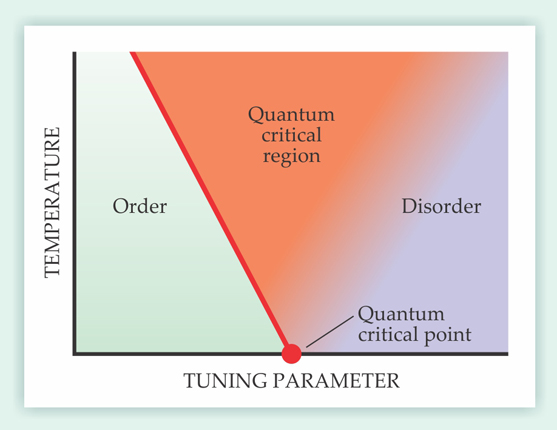 Comparing figures 1 and 3 shows that in the cuprate system, charge-carrier doping is the tuning parameter and the pseudogap region is the ordered phase. The adjacent “strange-metal” phase makes up most of the quantum critical region. (Among other anomalous properties, a strange metal’s electrical resistivity has a linear dependence on temperature rather than the expected quadratic dependence; see the Quick Study by Hong Liu in Physics Today, June 2012, page 68.) But the quantum critical region also includes a slice of the superconducting phase, which raises the intriguing possibility that quantum criticality may be central to the mechanism of high-Tc superconductivity.