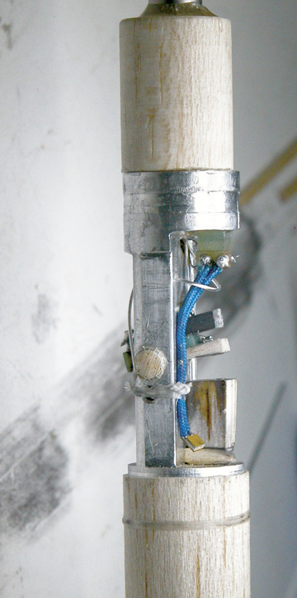 Figure 2. The apparatus for resonant ultrasound spectroscopy1 contains two transducers 1.5 mm in diameter, which weakly couple to a crystal to probe its vibrational resonances. Balsa wood provides vibrational isolation over a broad temperature range.