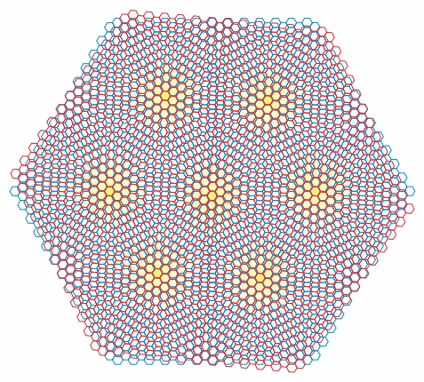 The moiré pattern between two honeycomb lattices is quasiperiodic over a much larger scale than either lattice itself. Highlighted in yellow are the repeating regions where the hexagons in the two sheets nearly align.