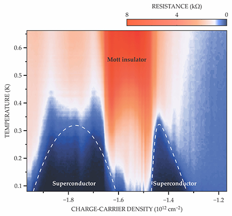 Because a Mott insulating phase, a type of correlated state, also shows up in the phase diagrams of some unconventional superconductors, Jarillo-Herrero and colleagues suspected that the unexpected insulating behavior was just the tip of the iceberg. To see what other surprises lay in store, they needed to refabricate their devices with six in-plane electrodes, not just two, and make their electrical measurements in a dilution refrigerator that could cool to 0.1 K. After several months of work, they had their results, as shown in figure