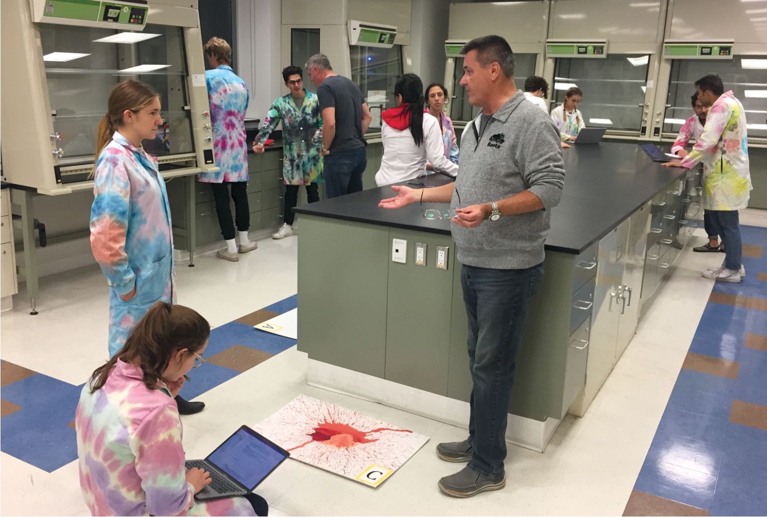 Blood spatter. For a module on forensic science, third-year students in the McMaster University integrated science program reconstruct the angle of impact, velocity, and distance traveled by blood in a mock accident scene.