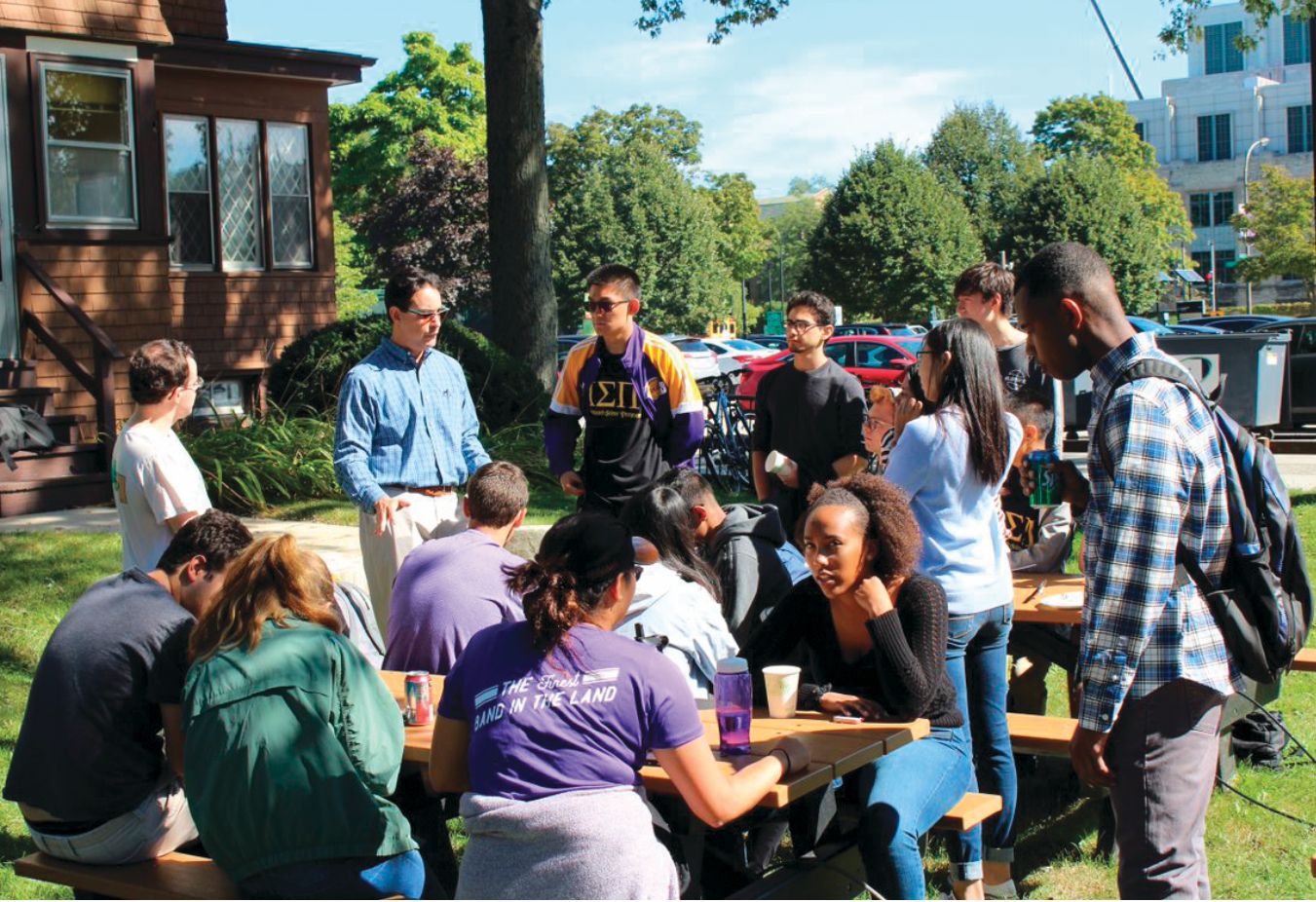 Students in Northwestern’s integrated science program enjoy a pre-pandemic picnic in front of the house where they study and socialize.
