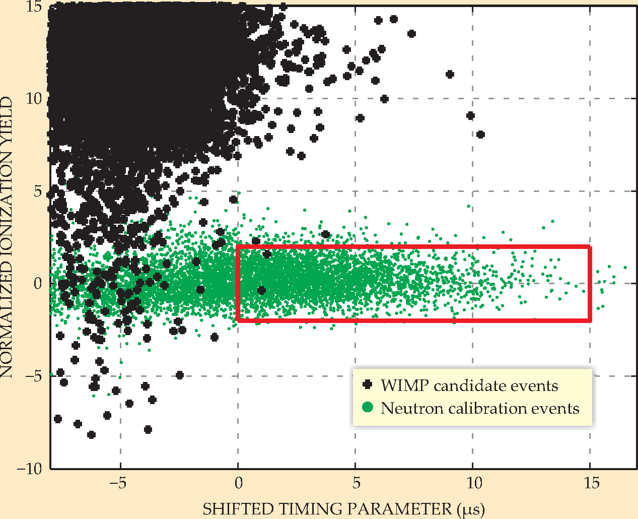 Figure 1. Ionization-yield and timing parameters for candidate WIMP-collision events that survived all prior event-selection cuts in the final year’s exposure of the CDMS II dark-matter detector. The two parameters, described in the test, serve to weed out imposter events. Ionization yield is plotted in standard deviations from the mean for nuclear recoils, as measured with neutron collisions (green dots) in calibration exposures. The zero point of the timing parameter is shifted to its final cutoff value. In the signal region defined by the final cuts (red box), only two WIMP candidates survive.