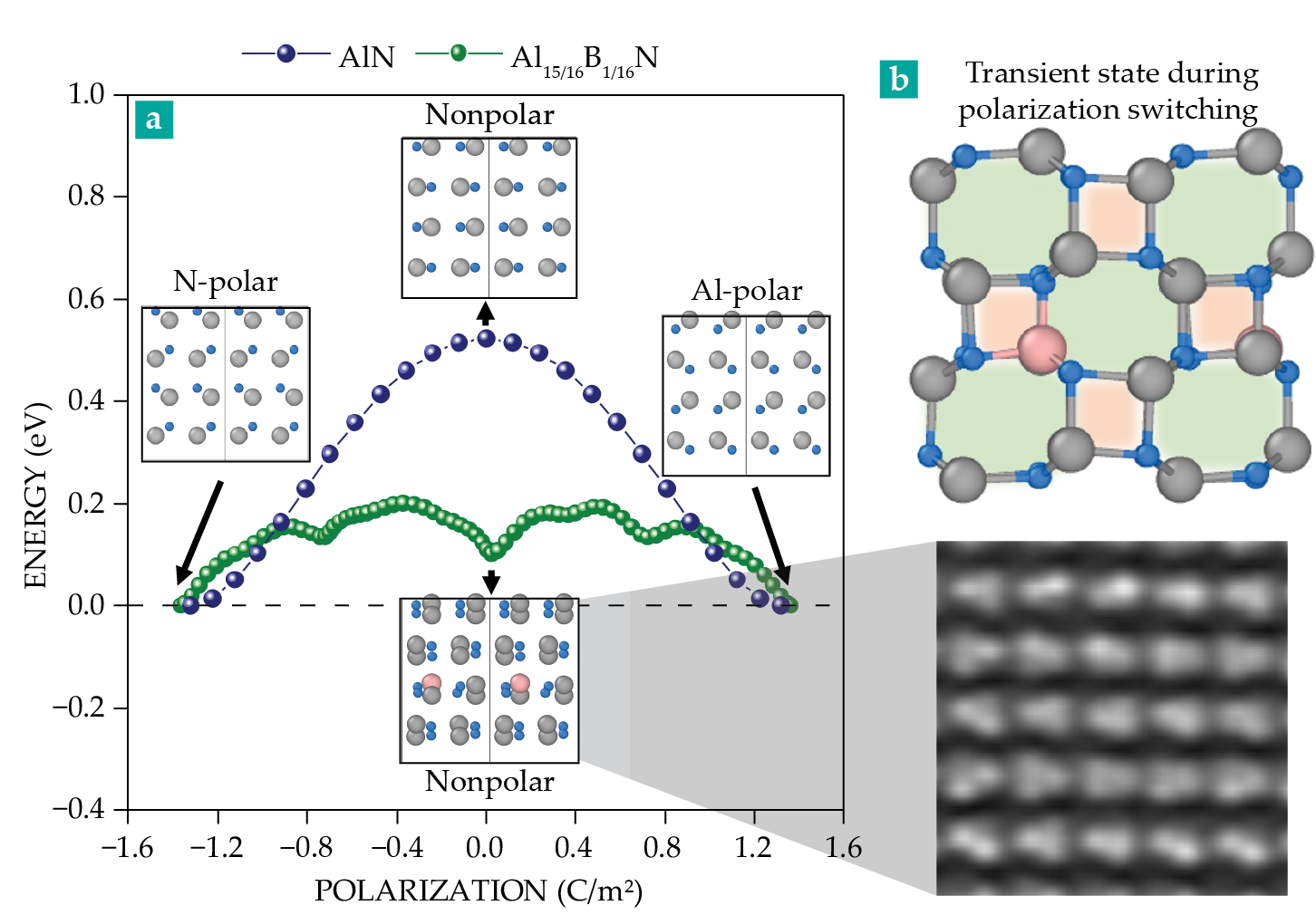 A first-principles calculation. Researchers move aluminum and nitrogen atoms in a film of aluminum nitride to determine the minimum energy pathway required to switch its polarization from N-polar to Al-polar. (a) Along one proposed path (blue), Al (gray) and N (light blue) atoms in each tetrahedron of a pure AlN film adopt a nonpolar, linear configuration midway. But that configuration, which has a 0.5 eV energy barrier, is never observed by transmission electron microscopy. Along an alternative path (green), the atoms switch polarization in multiple stages. (b) The green path’s intermediate structure was confirmed (bottom) in an experiment and predicted (top) in a nearly 30-year-old simulation to include area defects in the form of four- and eight-membered rings.