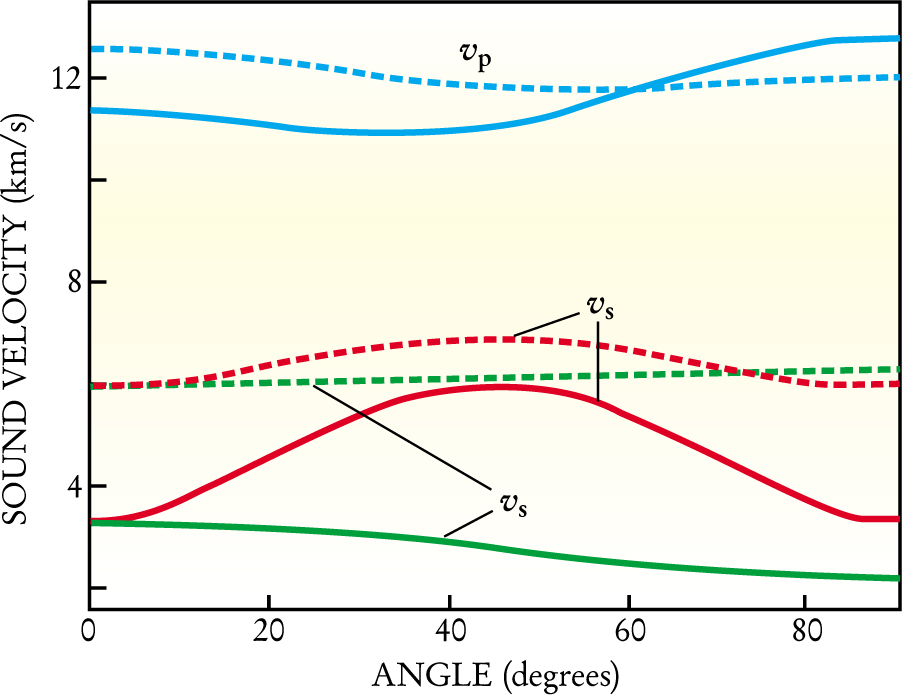squeezing polycrystalline samples of iron in the jaws of a diamond anvil to measure the anisotropy of elastic properties at high pressures. So far the experiments haven’t been extended to the very high temperatures of Earth’s core, but experimenters are trying. They have also developed special techniques to separate out the single-crystal elasticity from the effects of texturing in their polycrystalline samples.