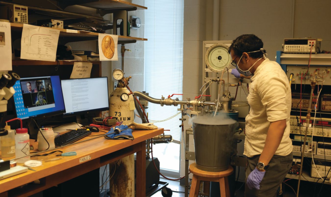 Physics graduate student Shubhang Goswami measures superconductivity in thin films. The experiment is part of a senior-level lab course at the University of Illinois at Urbana-Champaign. Undergraduates participate remotely and can partially control the measurements.