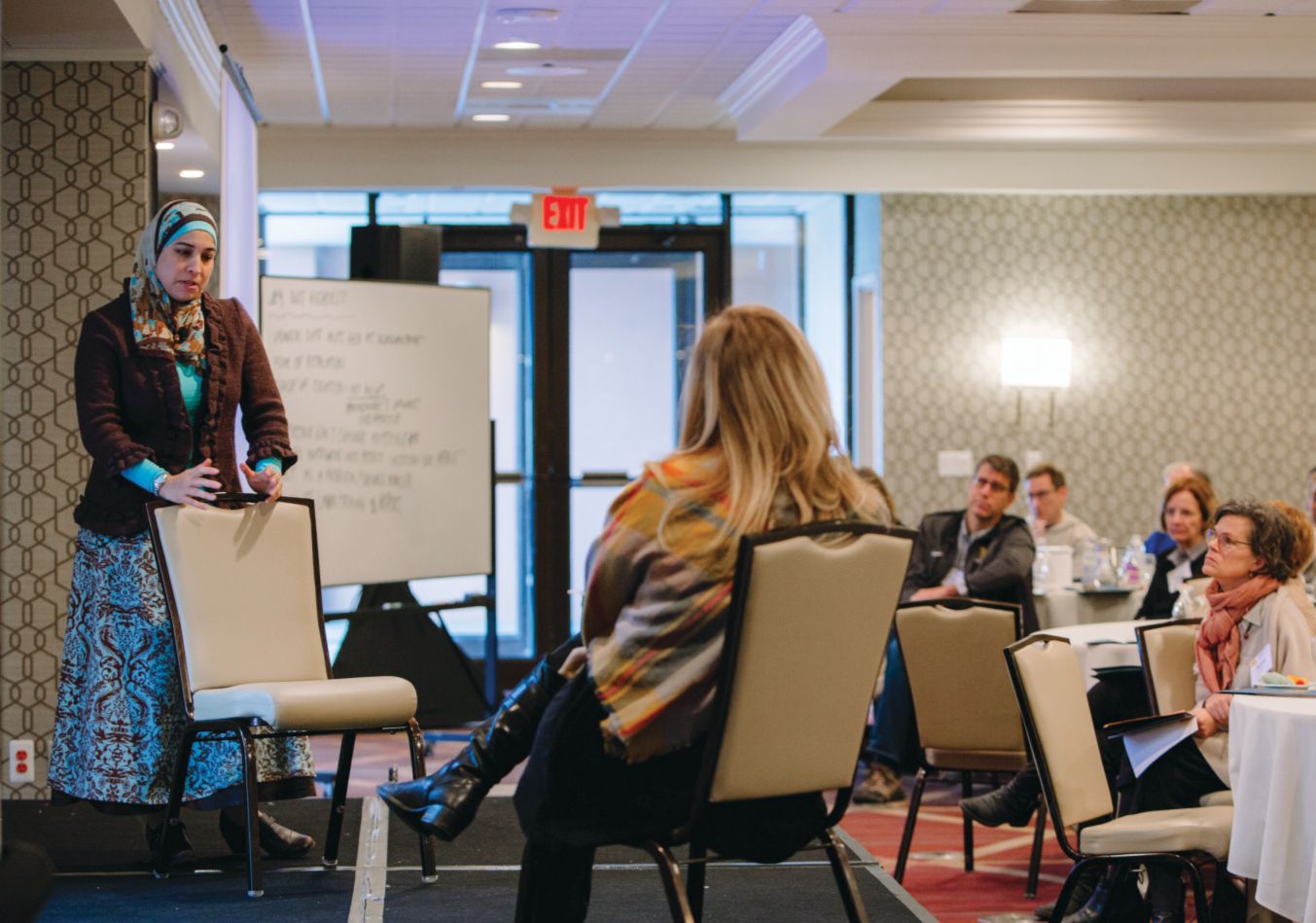 Theater sketches are one tool employed at the University of Michigan to advance equitable educational and professional practices. This scene is from a 2019 workshop for academic leadership teams that focused on creating work climates resistant to sexual harassment. Eamann Al-Azem (standing) portrays a professor working with her therapist to process Islamophobic incidents and sexual harassment that she and her students have experienced. The role play is followed by guided audience discussion. This and other professional development events are organized and run by the university’s Center for Research on Learning and Teaching.