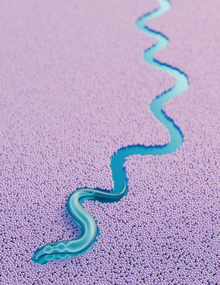 Looking for a meal, Caenorhabditis elegans slithers through a field of what, for all it can tell, are nutrient-rich bacteria. But actually, they’re polystyrene spheres embedded with force-sensitive nanoparticles. Tricking the millimeter-long worm into eating the micron-size pressure gauges is the first step toward measuring the forces exerted in its pharynx—the region from the front of the worm to the back of the second bulbous structure, where C. elegans crushes up its food—and other parts of its digestive tract. (Image courtesy of Jason Casar.)