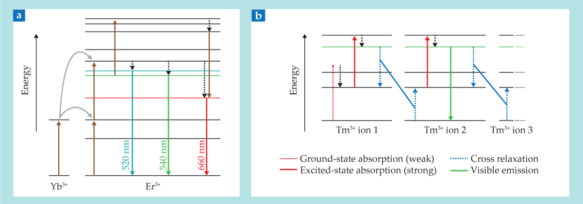 Mechanisms of up-conversion. (a) In a nanoparticle doped with ytterbium and erbium, Yb3+ ions absorb near-IR photons and transfer their energy to nearby Er3+ ions. Through a complicated network of photophysical pathways—sensitive to pressure, as it turns out—the Er3+ ions emit a combination of green and red photons. (Panel adapted from ref.