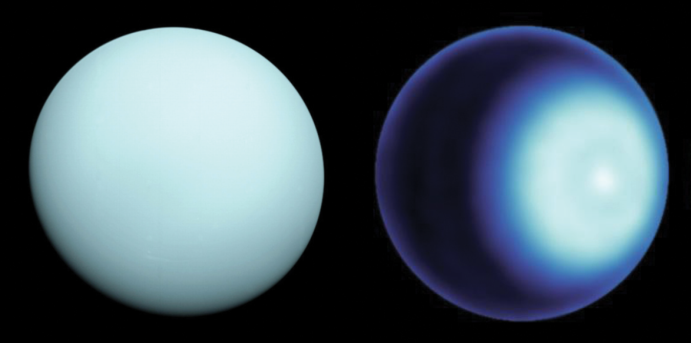 Pale blue dot. When Voyager 2 flew by Uranus in 1986, it sent back the visible-light photograph, shown here at left, of the planet’s outer layer of methane clouds. In the decades since then, Earth-based observations at longer wavelengths have probed deeper and uncovered the planet’s layers of hidden complexity. Shown at right is a new microwave image with signs of a cyclone at the Uranian north pole. (Left panel courtesy of NASA/JPL-Caltech; right panel courtesy of NASA/JPL-Caltech/VLA.)