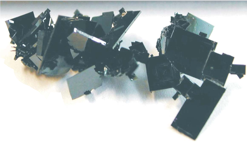 The high-temperature superconductor yttrium barium copper oxide is grown in crystal clusters; this one is about 2 cm from end to end. Typical experiments use single platelets from such clusters.