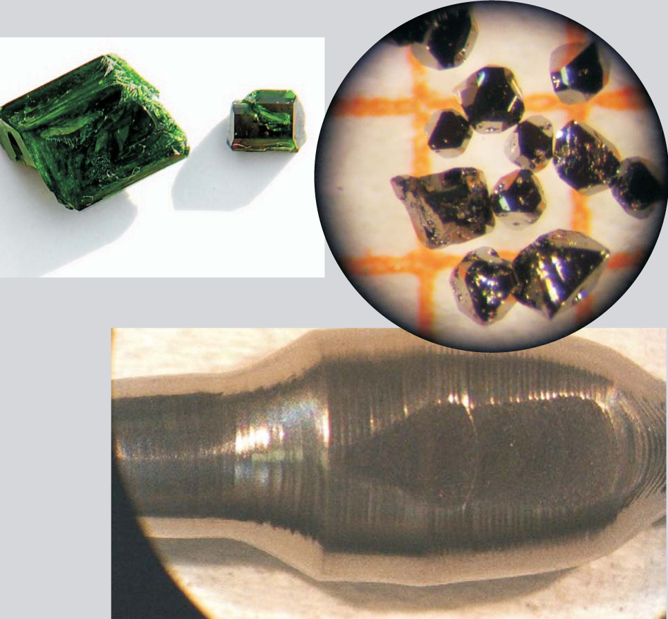 Crystals (clockwise from left): Nickel olivine (the larger crystal is roughly 1 cm long); single crystals of the filled-skutterudite praseodymium ruthenium arsenide (the orange square is 1 mm on a side); and a 4-cm-long specimen of the heavy-fermion superconductor uranium ruthenium silicide lightly doped with rhenium.