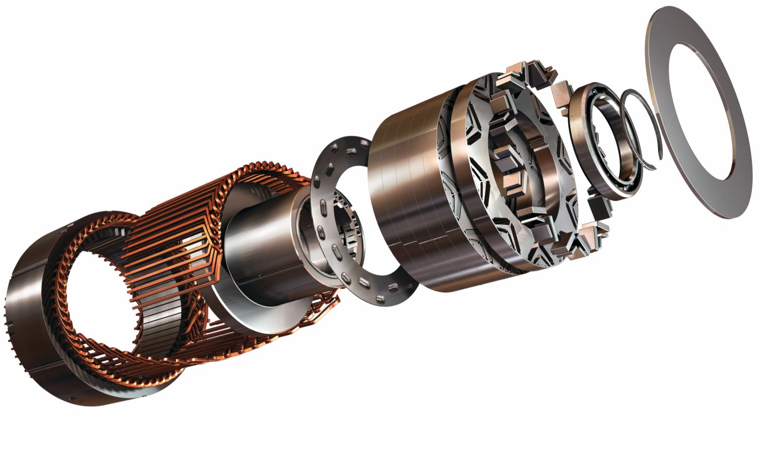 An exploded view of a permanent-magnet electric-vehicle traction (propulsion) motor. The rare-earth-containing magnets are embedded in the rotor.