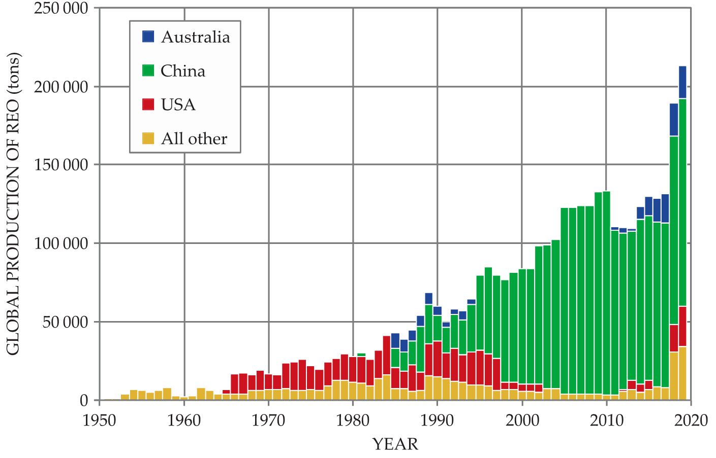 Principal national; contributions to global rare-earth oxide (REO) production, 1950–2019. (Adapted from A. King, Critical Materials, Elsevier, 2020, based on data from USGS Mineral Commodity Summaries.)