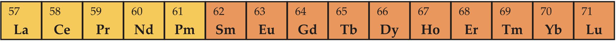 Rare-earth elements are those with atomic numbers between lanthanum (57) and lutetium (71). Scandium and yttrium are often considered REs because they share some properties. For a primer on rare earths’ electronic properties, see the Quick Study by Jianshi Zhou and Greg Fiete, Physics Today, January 2020, page 66