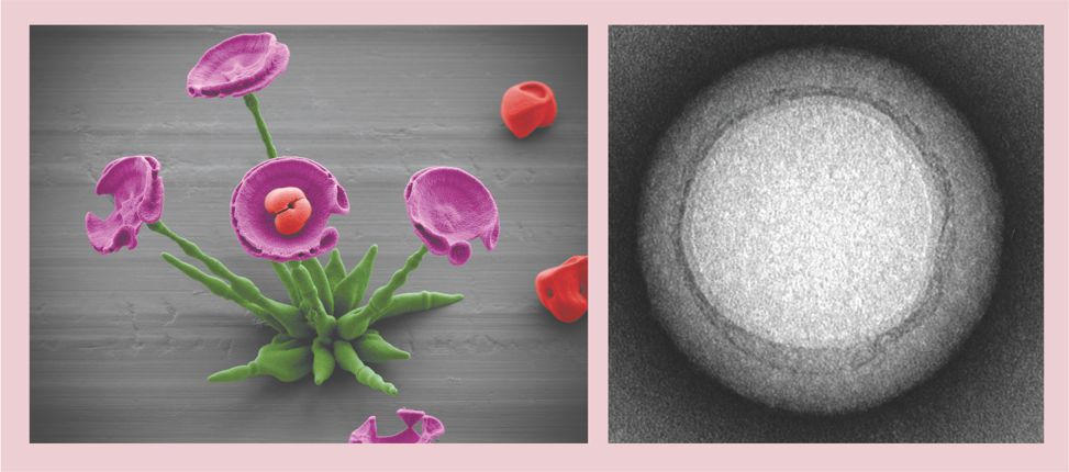 Chemically sculpted flower-like structures (left; in false color) up to 70 µm tall illustrate how micro-architecture is moving to a level of control needed for optical materials, catalysts, and other applications. And these 80-nm-diameter nanosponges (right), with their biodegradable, biocompatible polymeric cores camouflaged in red blood cell membranes, can circulate in the bloodstream to remove toxins such as E. coli and snake venom.