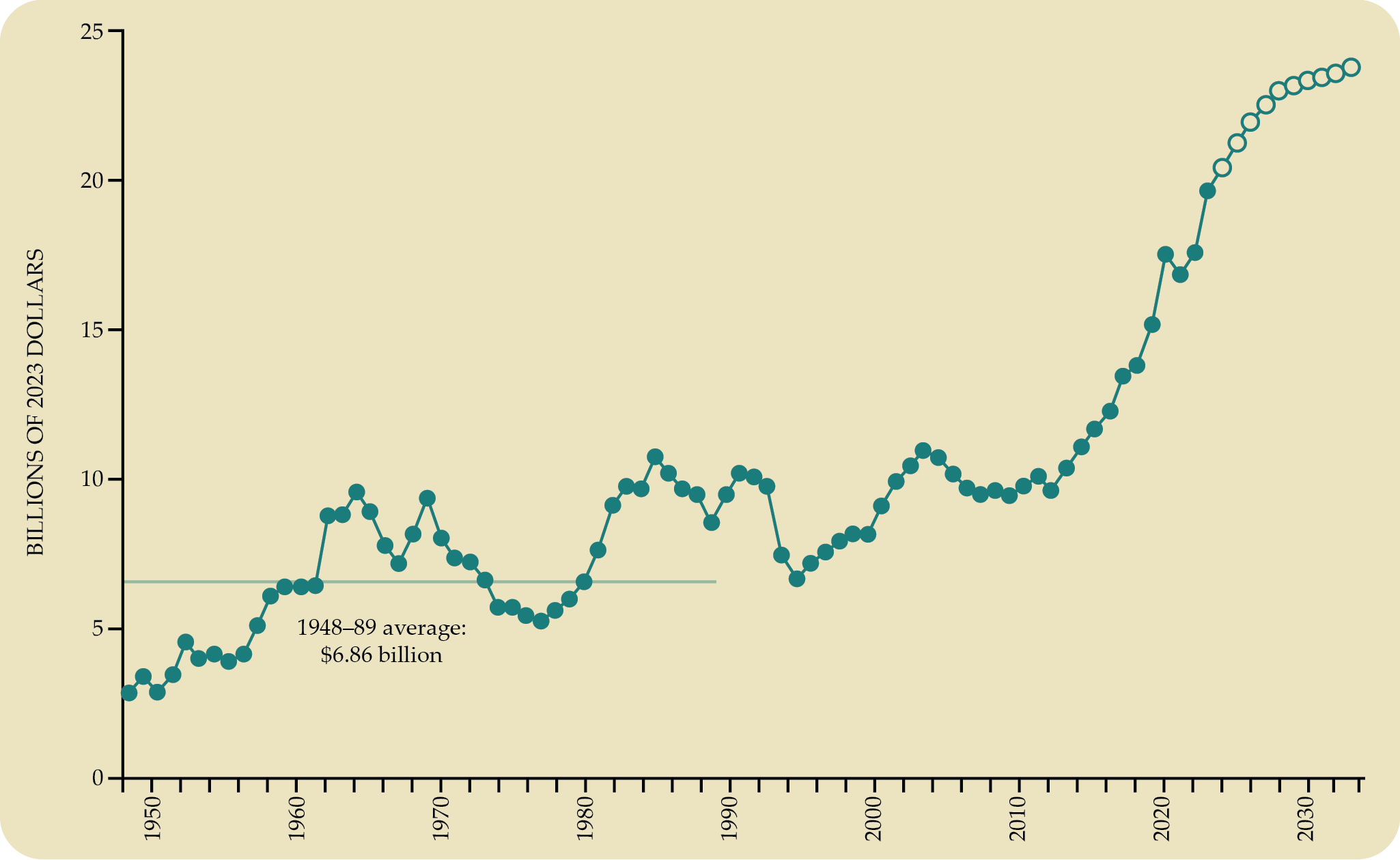 Nuclear weapons spending by the National Nuclear Security Administration and its predecessor agencies has been on a steep upward path in recent years and has doubled in real terms since the end of the Cold War. The chart shows the annual expenditures, including administrative costs, in constant 2023 dollars. Values for 2024 and future years are estimates. (Adapted from a figure provided by Los Alamos Study Group.)
