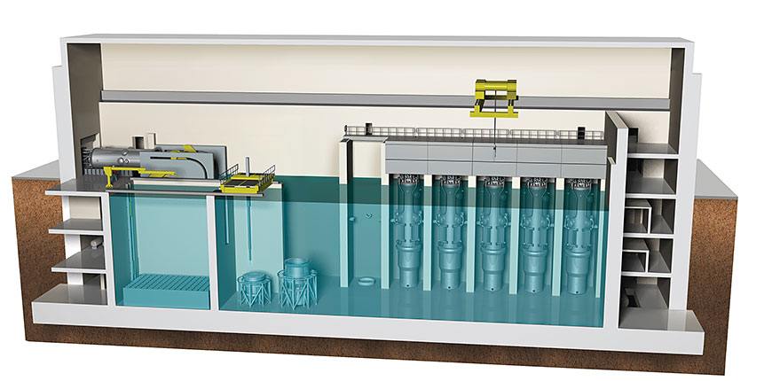 A cross-sectional representation of a NuScale small modular reactor building with five modules installed. A sixth module (left) is in the process of being loaded.