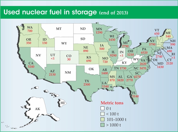 At the same time, Moniz said he was “very encouraged” by news that Waste Control Specialists (WCS), a private firm, will apply for a license to operate an interim storage facility in west Texas for up to 40 000 tons of spent nuclear fuel. He noted that the proposal is supported by the local Andrews County community and by “elements of the state’s political establishment. This is a positive statement that it is possible to have community and state support and that a consent-based siting process is the best way to proceed,” Moniz said. “We think the proposal is certainly worth serious consideration and evaluation.” The canceled geological repository at Yucca Mountain, Nevada, would have had a capacity of 70 000 tons. Commercial spent fuel, all now stored at reactor sites (see figure above), continues to grow by about 2000 tons per year, Moniz said.