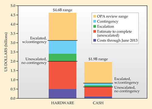 The OPA assessment tacked $1.5 billion onto the US project office’s $3.1 billion hardware cost estimate, including upping the contingency to 130%. The OPA review more than doubled the project office’s cash estimate, to $1.9 billion. “What [OPA] did was to answer the question, ‘How bad could it get—what is the outer bound on the cost?’ They took pessimistic assumptions,” Sauthoff said.