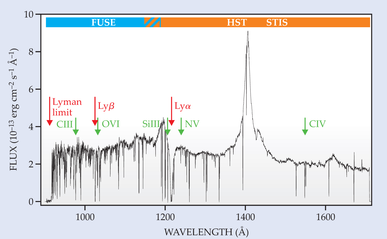Figure 2. The UV spectrum from the quasar PG 1211+143 as observed by the Far Ultraviolet Spectroscopic Explorer (FUSE) and the Space Telescope Imaging Spectrograph (STIS) on the Hubble Space Telescope (HST). The broad peaks originate from the quasar itself, whereas the narrow absorption lines originate from filaments or clouds of gas that lie at various redshifts between Earth and the quasar.