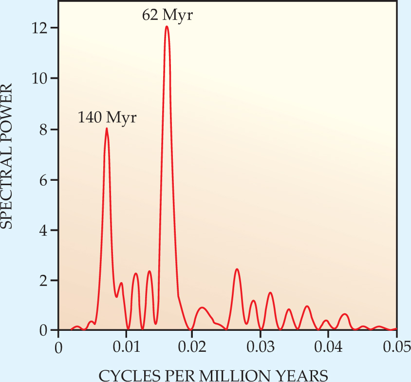 Two years ago physicist Richard Muller (University of California, Berkeley) and his student Robert Rohde discovered a 62-million-year periodicity in the wordwide diversity of marine animals. 1 They had undertaken a Fourier analysis of the time variation of the total number of genera listed in John Sepkoski’s authoritative Compendium of Fossil Marine Animal Genera, which begins about 542 Myr ago—when animals first developed the hard exo- and endo-skeletons that facilitate fossilization.