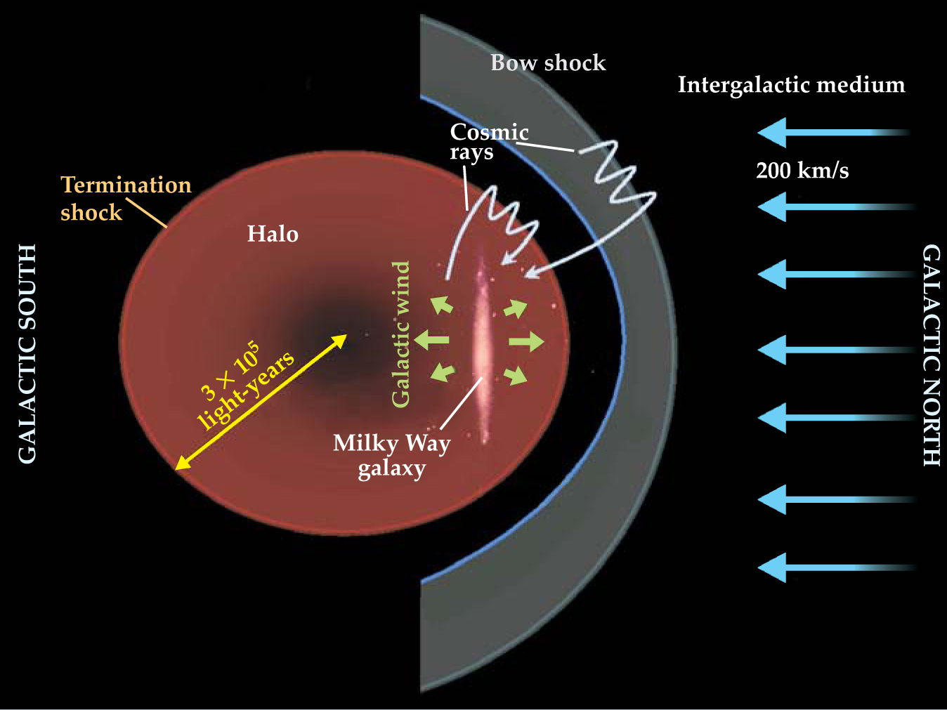 Figure 2. The disk-shaped Milky Way galaxy and its gaseous halo, formed from galactic wind, plow northward through the intergalactic medium at about 200 km/s. That movement creates a bow shock front north of the halo, and it pushes the halo’s center well south of the galactic disk. The bow shock and the termination shock front that bounds the halo are places where ambient protons in the intergalactic medium or the halo can, by repeated encounters, be accelerated to become high-energy cosmic rays.