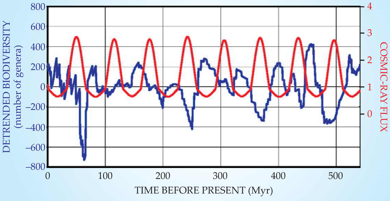For the moment, Medvedev and Melott don’t advocate any particular one of those mechanisms as the culprit; nor do they argue that the cyclically increased extragalactic cosmic-ray flux is the overwhelming mechanism for biodiversity dips and major extinctions. The great extinction at the end of the Cretaceous Period 65 Myr ago was almost certainly the consequence of an enormous bolide impact. And the even greater Permian extinction 250 Myr ago is attributed primarily to an outbreak of volcanism. Furthermore, local super-novae can produce randomly episodic large increases in the cosmic-ray flux.
