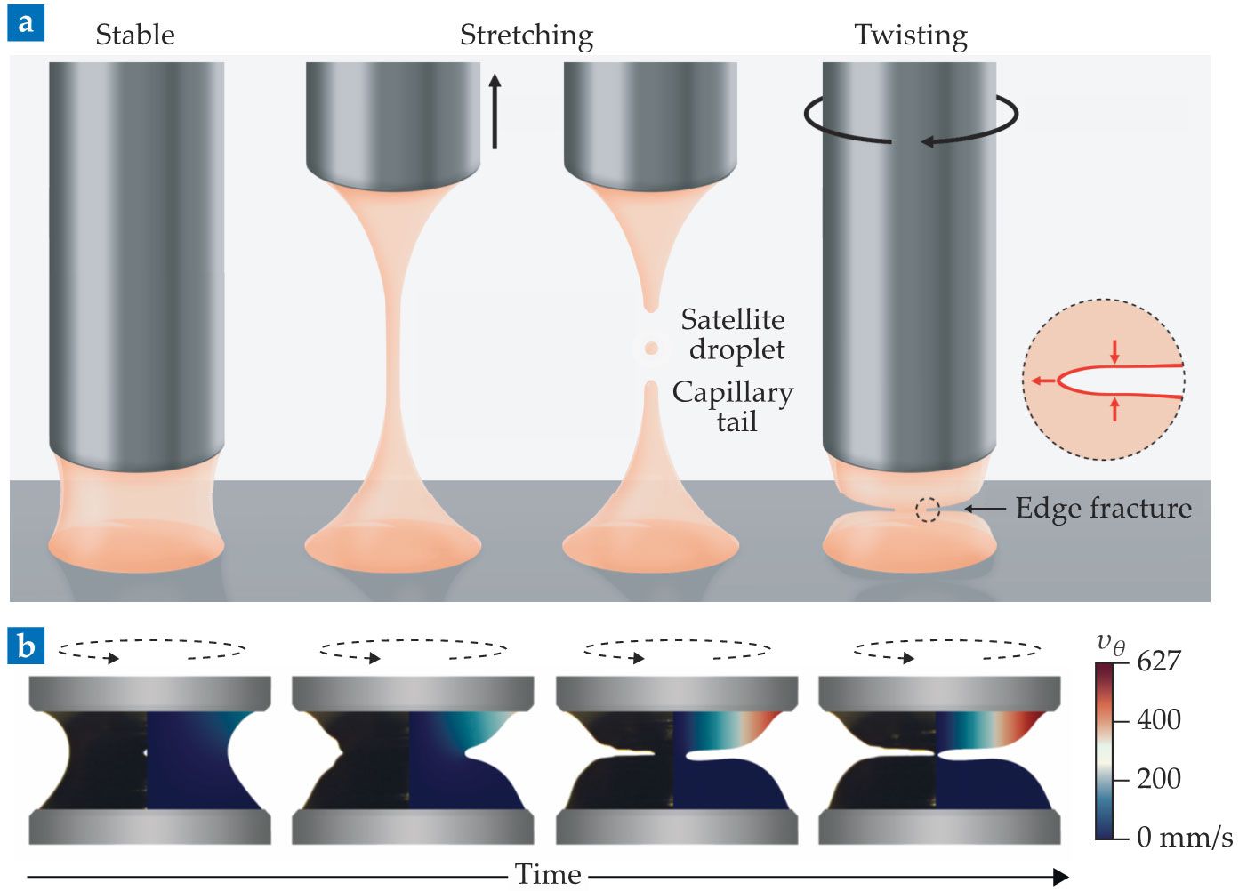 Edge fracture is typically viewed as a problem in rheological measurements because it makes results harder to interpret. But for clean dispensing, edge fracture is advantageous. “Instead of avoiding the elastic property of the viscoelastic liquid bridge, we amplify it to the extreme where fracture occurs,” says Shen.