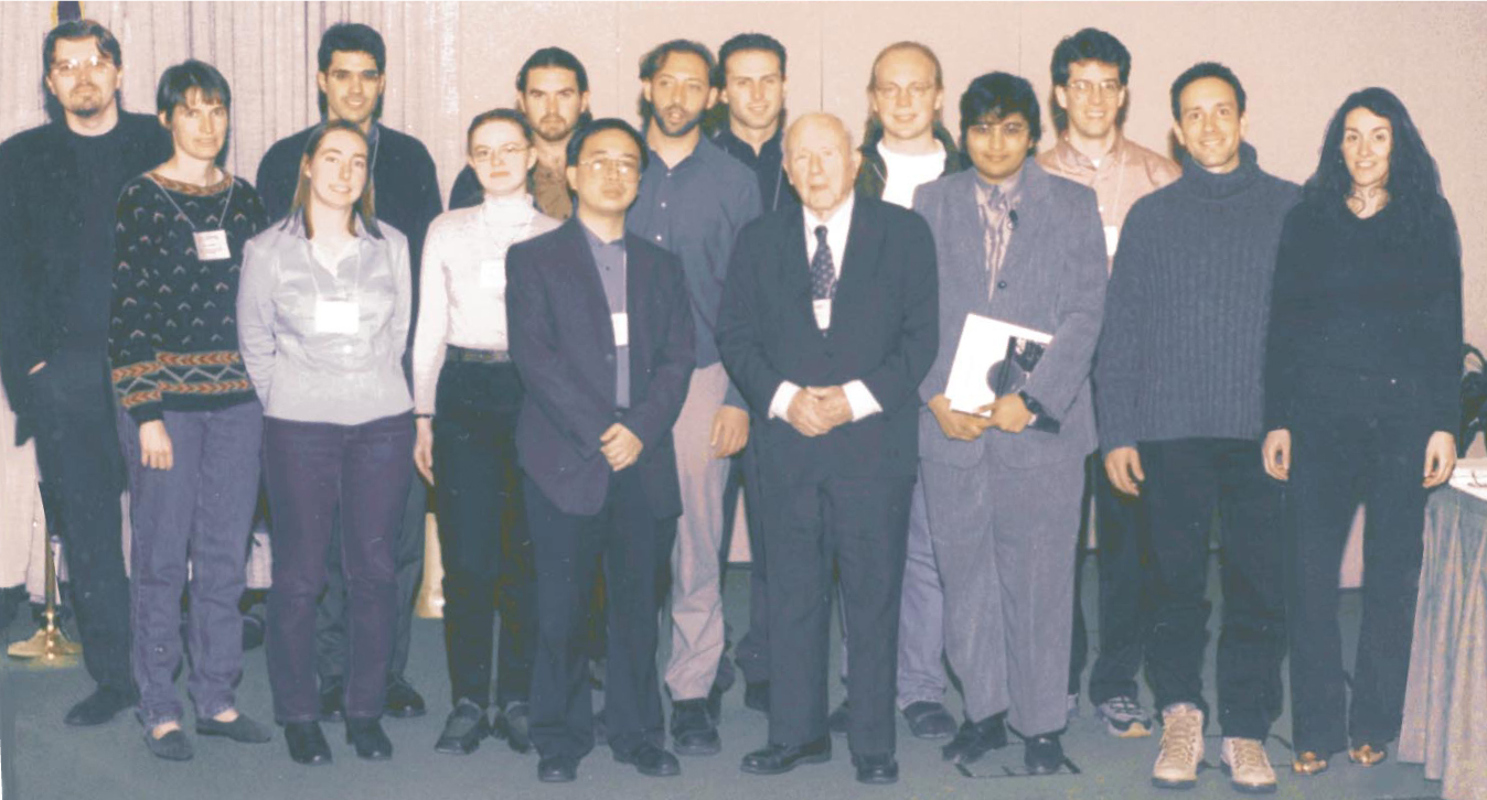 John Archibald Wheeler and the Young Researcher Competition finalists. From left to right: Vlatko Vedral (Imperial College, London); Mary Rowe (NIST, Boulder); Nicole Bell (NASA/Fermilab); André Stefanov (University of Geneva); Olga Khovanskaya (Moscow State University); Jeremy O’Brien (University of Queensland); Jianwei Pan (University of Vienna); Jonathan Oppenheim (The Hebrew University, Jerusalem); Michael Murphy (University of New South Wales); Wheeler; Mark Topinka (Stanford University); Anita Goel (Harvard University); Steven Gubser (Princeton University); Raphael Bousso (University of California, Santa Barbara); and Fotini Markopoulou (University of Waterloo, Canada). Not shown is Jiangping Hu (Stanford). This is a digital composite of two photos.