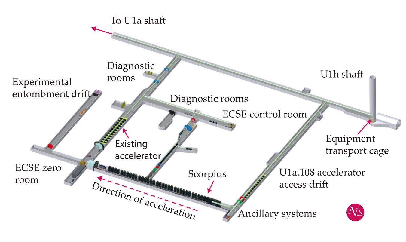 A schematic of the U1a tunnels shows the locations of the proposed Scorpius electron accelerator and one of the two existing accelerators. Scorpius will produce x rays to image the hydrodynamics of plutonium as it implodes. The smaller accelerator will generate high-energy neutrons to probe time-dependent neutron reactivity during implosions. Both types of experiments occur inside containment vessels located in the zero room at the lower left. Spent vessels are entombed in the vertical tunnel at the far left. (Courtesy of Los Alamos National Laboratory.)