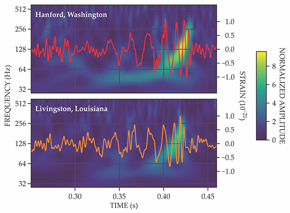 A chirp of gravitational waves from two coalescing black holes 1.3 billion light-years away was captured by the two LIGO detectors on 14 September 2015. The plot depicts strain; the background colors indicate signal amplitude at various frequencies. (Courtesy of Caltech/MIT/LIGO Laboratory.)