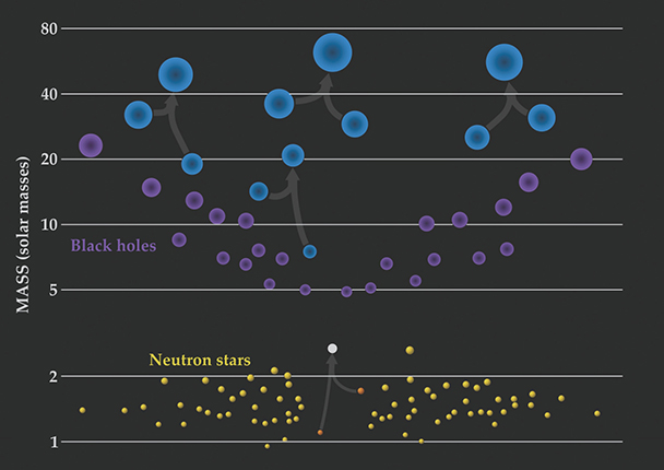 Adding inventory.Gravitational-wave observatories are uncovering objects that are difficult to spot with traditional telescopes, including black holes (blue; the arrows indicate them merging) that are more massive than much of the previously known stellar-mass population (purple). The recently observed neutron-star merger (bottom center) will help constrain the properties of the city-sized objects (previous detections in yellow). (Courtesy of Caltech/MIT/LIGO Laboratory.)