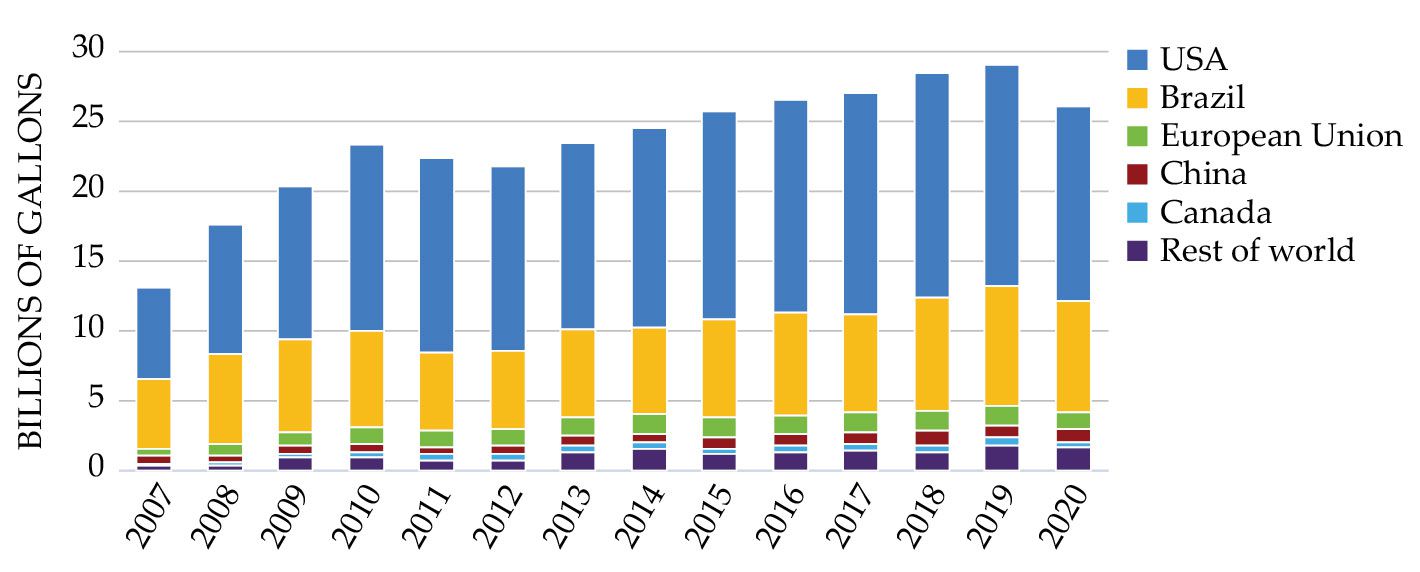 Global ethanol production. (Courtesy of the US Department of Energy, based on Renewable Fuels Association data.)