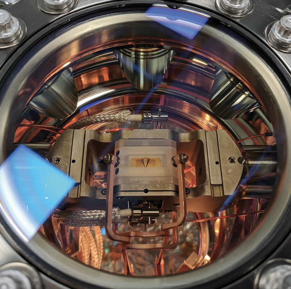Gold electrodes produce a trap for charged particles in this ion-trap quantum computer. The electrodes are structured to permit microwave and laser-beam access. The entire system is housed in an ultrahigh-vacuum chamber. (Photo by Michael J. Biercuk, University of Sydney.)