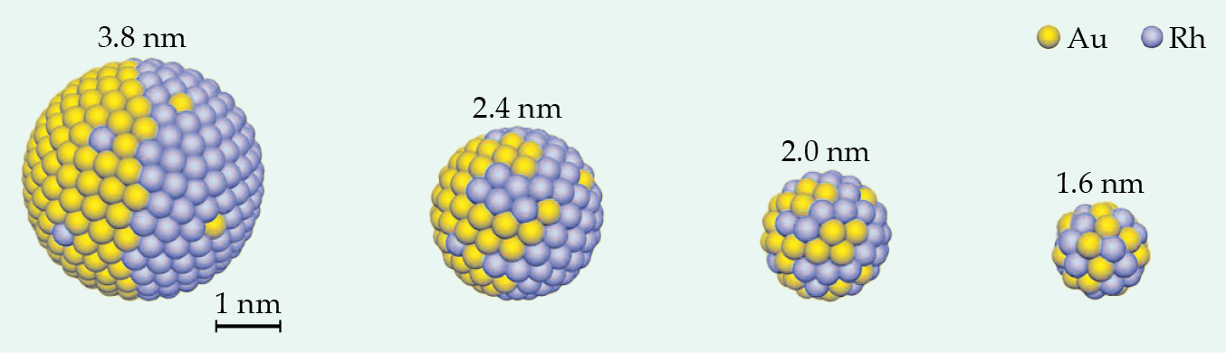 At bulk scales, gold and rhodium are incompatible metals. Even in particles as small as 3.8 nm, the metals remain mostly separate. In such particles, the two metals segregate into separate regions, as shown in figure 1; they are thus sometimes called Janus particles after the Roman god of duality, who had two faces. But below 2 nm, the thermodynamic balance shifts, and the researchers found that a completely mixed alloy forms.