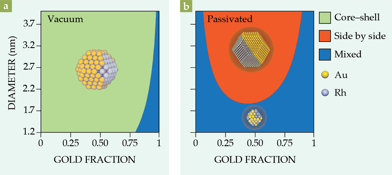 Thermodynamic models predict the structure of gold–rhodium nanoparticles. (a) Pure gold and rhodium mixtures synthesized in UHV should stratify into a core of rhodium surrounded by a shell of gold. (b) Surface passivation of nanoparticles changes their stable structure to either fully mixed or unmixed side-by-side domains. (Adapted from ref. 1.)