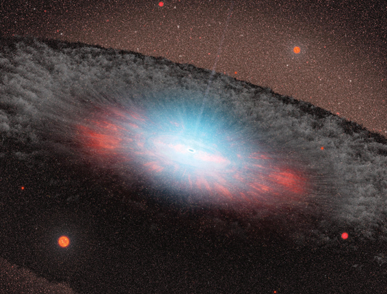In some galaxies, including our own, the black hole sits inconspicuously in the middle. But in others, the black hole is orbited by a thick toroidal disk of hot gas. As material in the disk spirals toward the black hole’s event horizon, the disk’s inner region becomes so agitated and hot that it radiates copiously (see the accompanying artist’s impression). Such systems are known as active galactic nuclei, of which there are two broad classes. Type 1 AGNs have broad emission lines characteristic of hot, fast-moving matter. Type 2 AGNs have narrow lines characteristic of cool, slow-moving matter. Given that a thick torus shrouds the AGN engine, the two AGN types could conceivably differ only by viewing angle: Type 1s afford a face-on view of the hot, swirling inner disk; type 2s, an obscured view. Known as AGN unification, that appealing explanation can account for some of the differences between the two AGN types, but not all of them. Now Beatriz Villarroel and her thesis adviser Andreas Korn of Uppsala University in Sweden have shown that another factor is at play. Using data from the Sloan Digital Sky Survey, Villarroel and Korn looked at the neighboring galaxies of a sample of 11 334 type 1 and 53 416 type 2 AGNs. If viewing angle were the sole discriminant, the properties of galaxies in an AGN’s vicinity would have no bearing on its type. But that’s not the case. Compared with the neighbors of type 1s, the neighbors of type 2s are significantly bluer and seem to be making more stars. Although viewing angle does influence an AGN’s outward appearance, Villarroel and Korn’s findings indicate that type 1s and type 2s are intrinsically different, perhaps because of their collision histories. (B. Villarroel, A. J. Korn, Nat. Phys. 10, 417, 2014, doi:10.1038/nphys2951