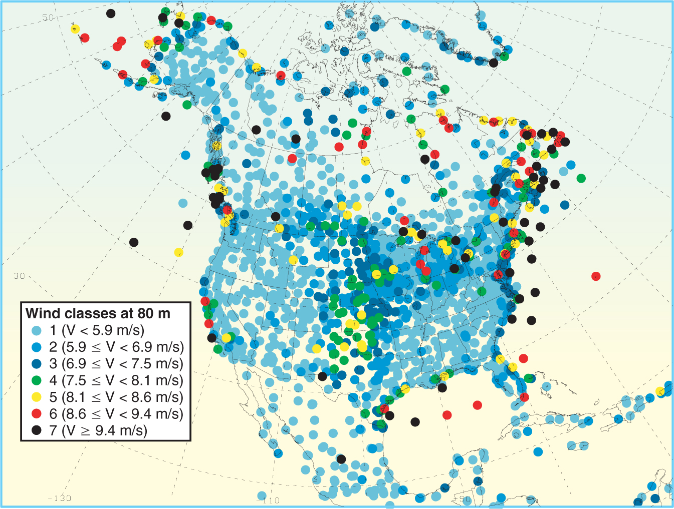 Wind speeds (V) measured at sounding stations around the globe were used to estimate values at other sites. For wind speed maps of other regions, see