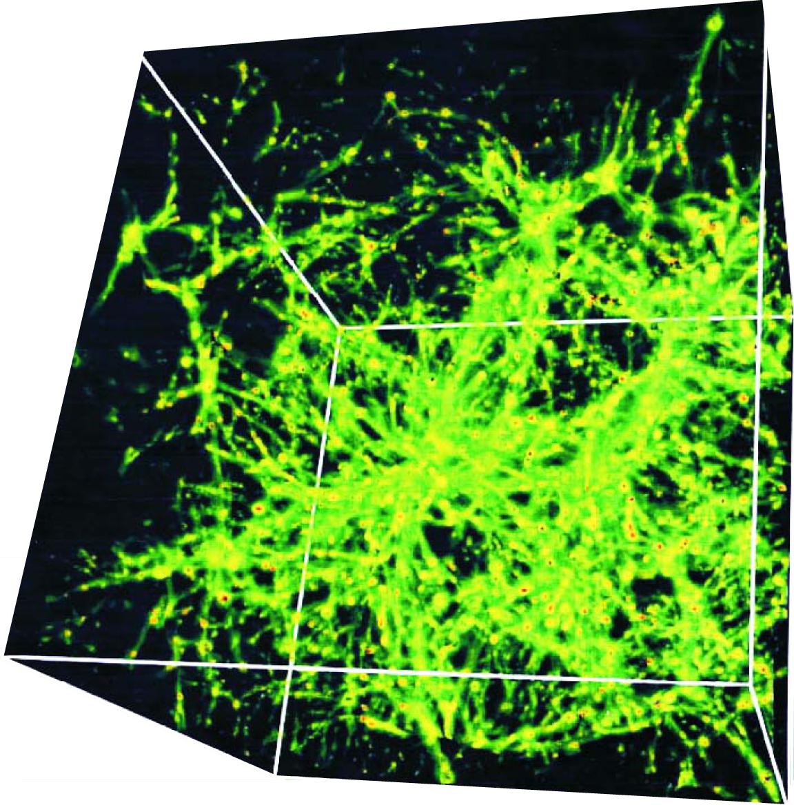 Where are the rest of the baryons, and how can they be detected? Cen and Ostriker concluded that, after z = 1, almost half of the baryons in the cosmos have been residing in a “warm–hot intergalactic medium” (WHIM), a filamentary web of very-low-density gas—mostly hydrogen. With temperature ranging from 105 to 107 K, the WHIM is overwhelmingly ionized and therefore leaves no obvious trace in the Ly α forest. Figure 1 shows the simulated distribution of the WHIM in the present epoch. The largest concentrations of galaxies occur at the nodes of this cosmic web.
