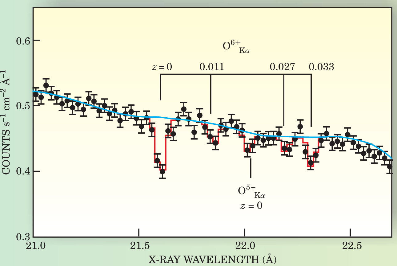 Figure 2. Soft x-ray spectrum of the blazar Markarian 421 shows absorption lines attributed to Ka transitions of highly ionized oxygen at several red-shifts z. The O6+ lines at z = 0.011 and 0.027, is particular, are taken as evidence for absorption in foreground filaments of the putative warm–hot intergalactic medium. The blue and red curves show, respectively, the fitted blazar continuum and absorption lines.