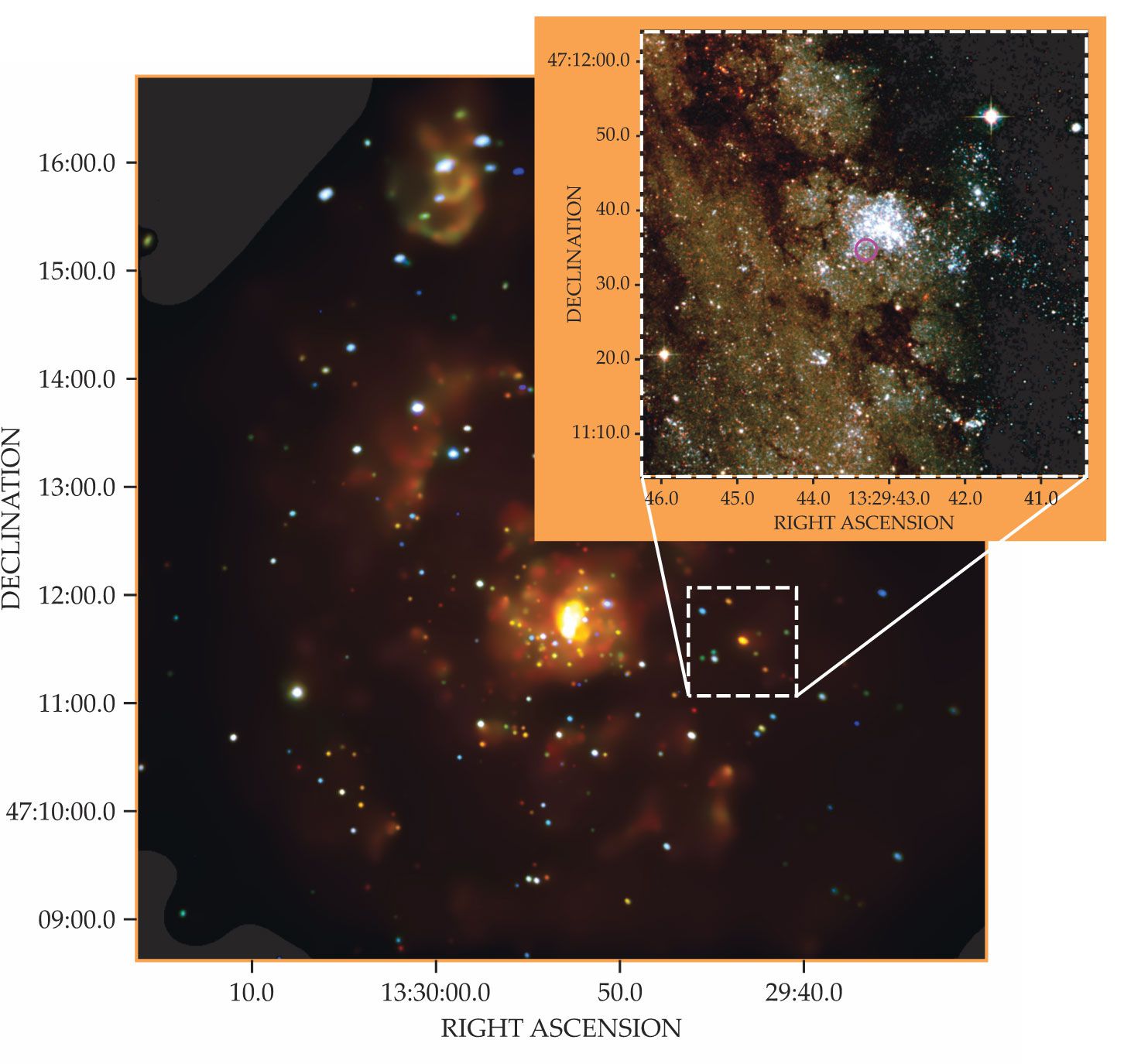 Chandra and Hubble. This Chandra X-Ray Observatory image of Messier 51, known as the Whirlpool galaxy, reveals discrete x-ray light sources. The boxed region near a cluster of young stars contains an x-ray binary system. In the inset, the Hubble Space Telescope reveals an optically more crowded environment (the binary is circled in magenta). Insensitive to those optical signals, Chandra isolates the dip in the binary’s x-ray flux when a putative planet blocks it along Earth’s line of sight. (Adapted from ref. 2.)