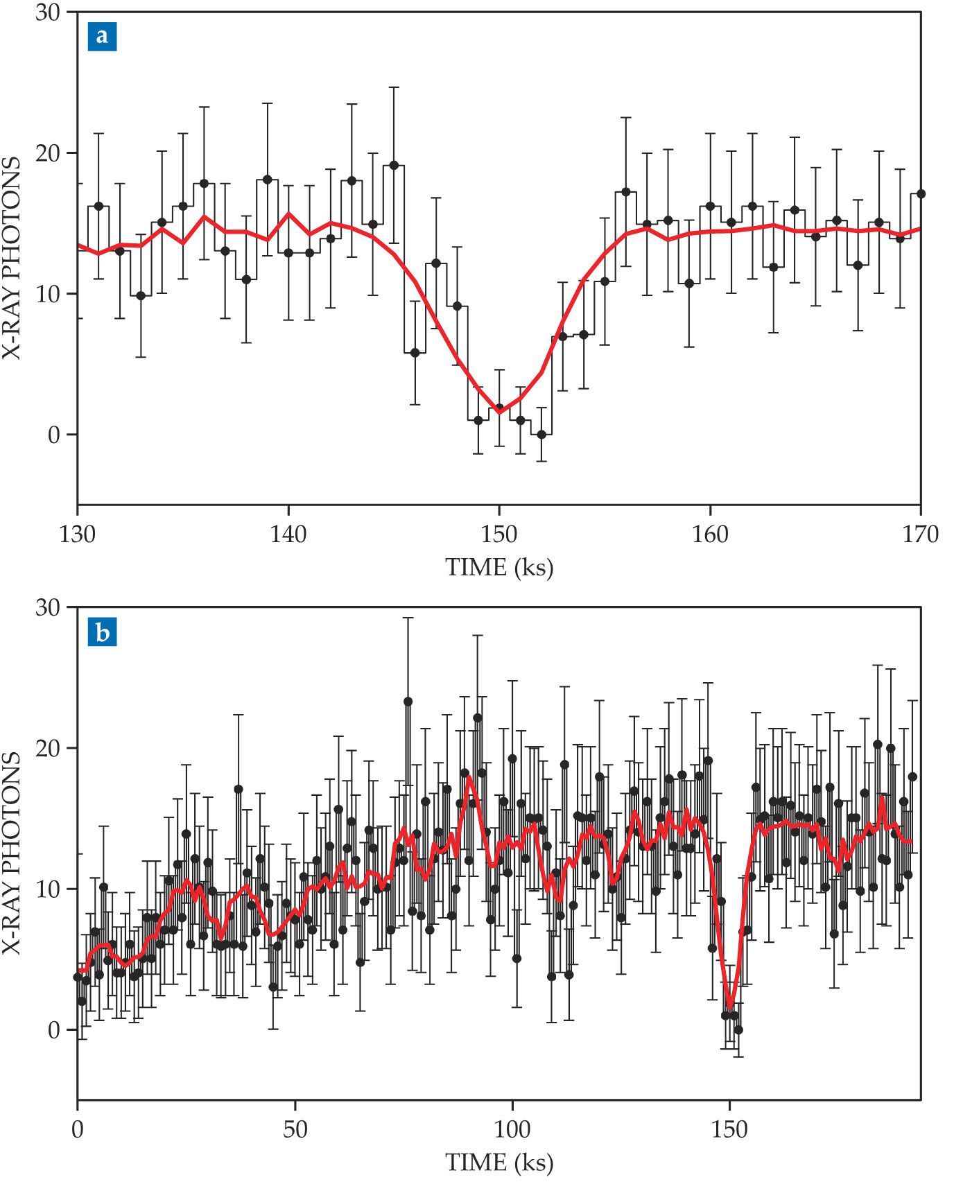 Light curves. A short-duration eclipse is observed in the x-ray flux from the accretion disk around a black hole or neutron star that siphons gas from a massive companion star. (a) The telltale feature of a planetary transit—an abrupt dip and subsequent rise in flux—is consistent with the presence of a Saturn-sized planet. (b) In this entire duration of the observation, intrinsic variability can cause the flux rate to drop to zero even during periods not associated with the transit. (Adapted from ref. 2.)