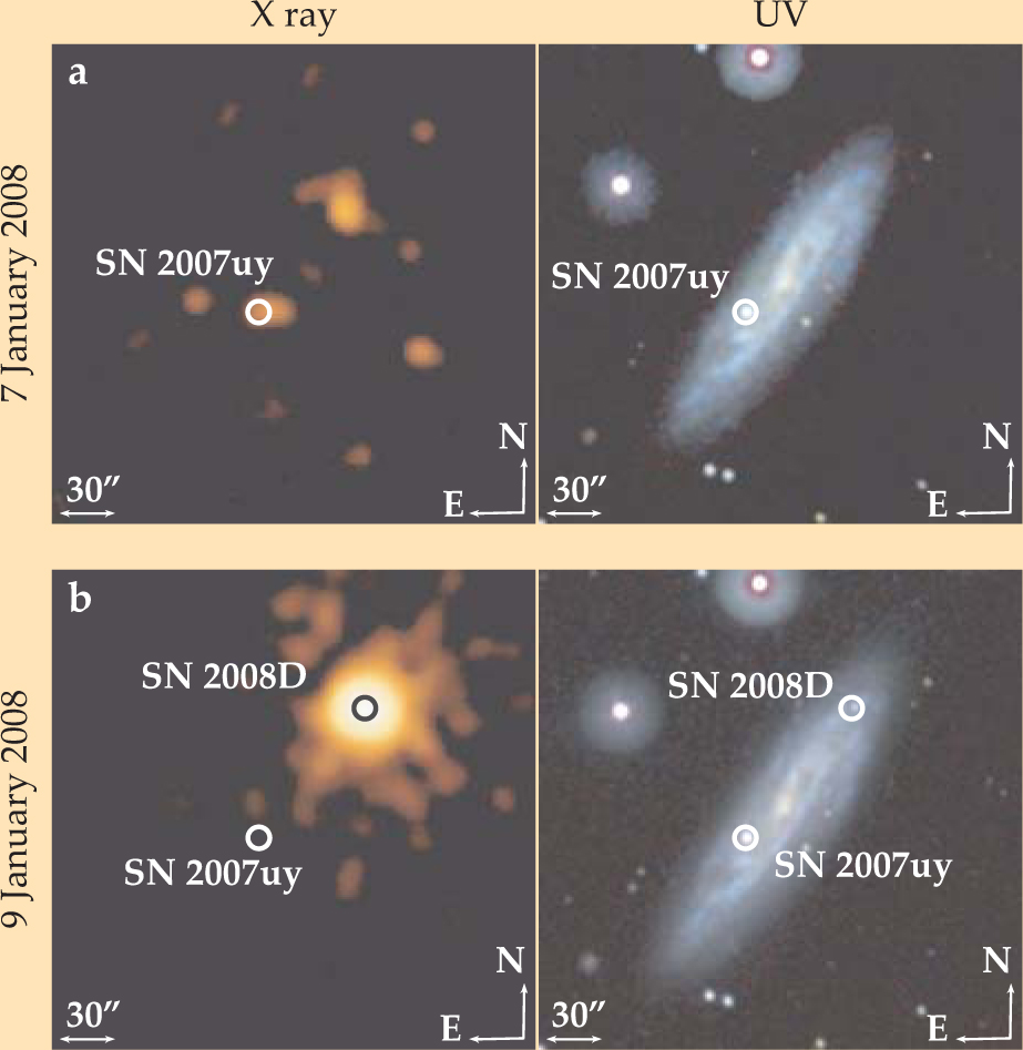 Figure 2(a) shows Swift’s x-ray and UV exposures of the galaxy on 7 January. At the position of the two-week-old SN 2007uy, there’s a very faint x-ray afterglow. But its UV image is still bright. At the position of the yet unborn SN 2008D, there’s nothing to be seen.