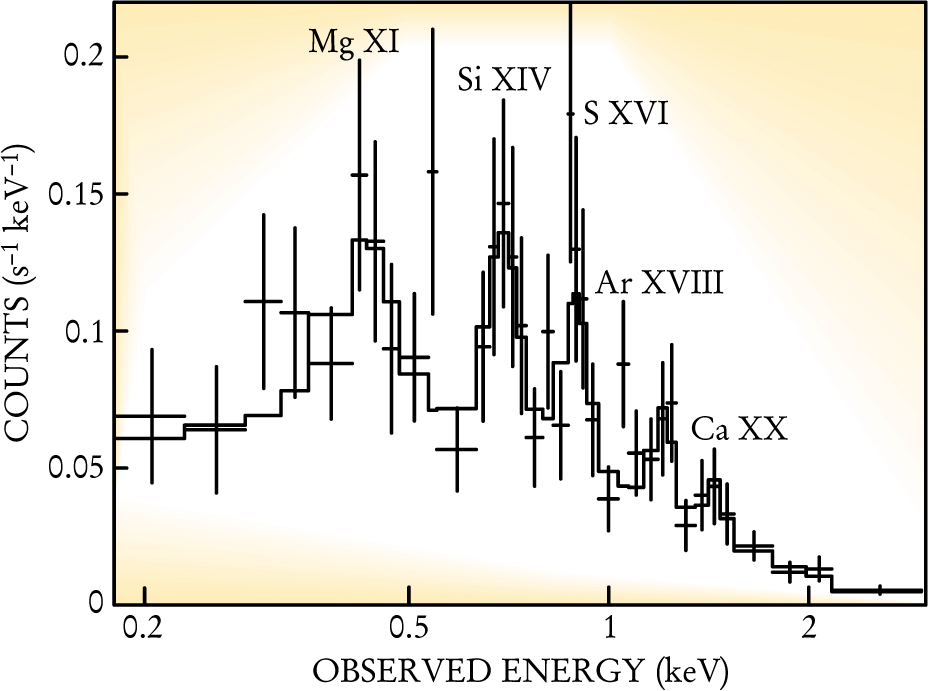 Figure 1 shows the emission spectrum integrated over the first 5000 s of the run. Reeves and colleagues concluded that the data suggest emission from an optically thin plasma with a temperature of 5 × 107 K and a luminosity of 7 × 1038 watts. By comparing the redshift z of the elemental line energies in the x-ray spectrum with the redshift of the burst obtained from the optical afterglow, they determined that the material emitting x rays was flowing outward from the source of the GRB at 8.6% of light speed. Combining this speed with the luminosity and temperature of the x-ray emitting plasma they studied, the group estimated the emitting material’s mass and kinetic energy. The derived mass is about 1/10 that of the sun, and the kinetic energy about 1044 joules, values consistent with single progenitor models with jetted GRBs.
