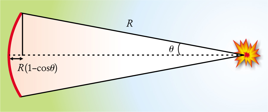 Afterglows Are Emitted over a section of a sphere (red) of halfopening angle θ, located a distance R from the gamma-ray burst. Thus, different bits of x-ray-emitting material are located at various distances from us. The diagram illustrates the geometric part of the argument whose conclusion is that material ultimately shocked into emitting x rays was ejected from a massive progenitor some 10–100 hours before the gamma-ray burst.