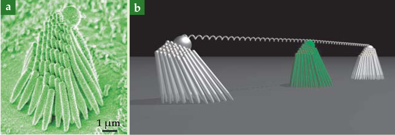 Figure 1. The hairs that sprout from hair cells convert sound vibrations to nerve signals. (a) As this electron micrograph shows, the hairs are arranged in a pyramidal bundle topped by a structure called the kinociliary bulb. (b) To investigate the role of intercell coupling, the Paris-Dresden team extracted a hair cell and applied a time-dependent force to it with a flexible whisker. By using a model of how hair cells behave mechanically, the team could control the whisker in a way that mimics the situation shown here: a live cell (green) yoked elastically (white springs) to two virtual cells (white).
