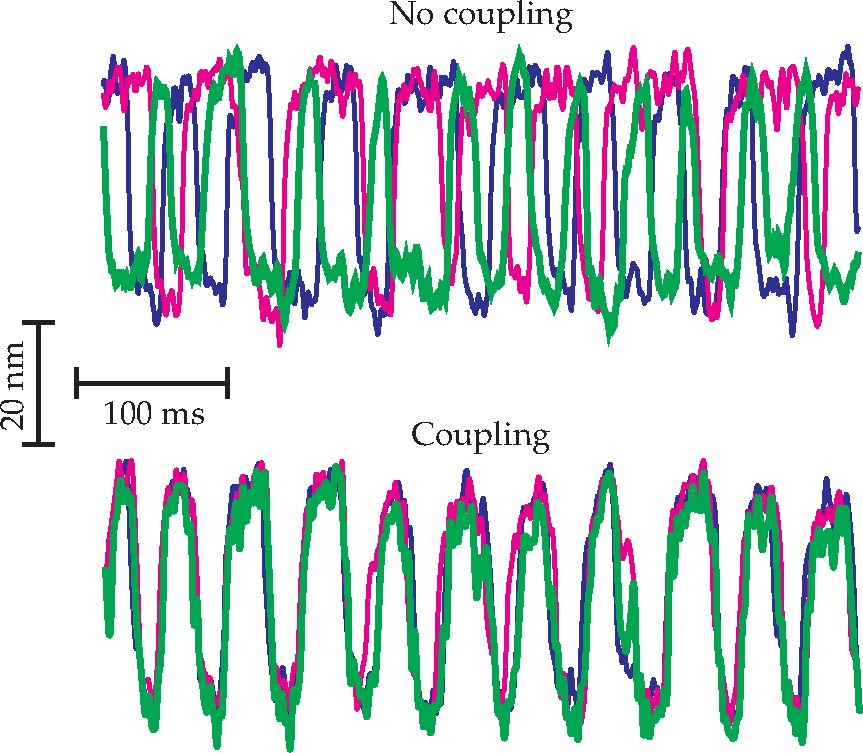 Figure 2. Hair cells amplify signals by driving their hairs to oscillate in resonance with incident sound. When no sound is present, the hairs oscillate spontaneously. By coupling a live cell (green) to two cyber clones (pink and purple), the Paris-Dresden team demonstrated that coupling brings spontaneous oscillations into phase, thereby mitigating the effects of stochastic fluctuations and lowering the detection threshold.